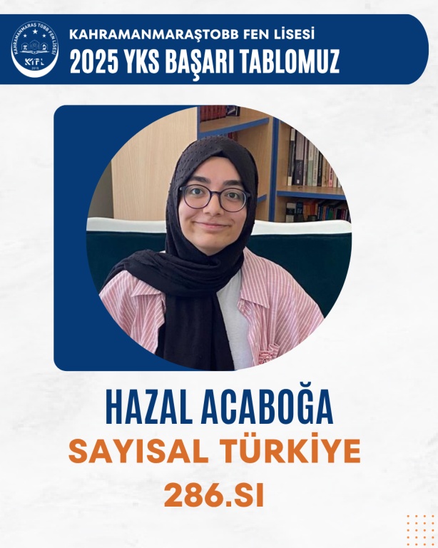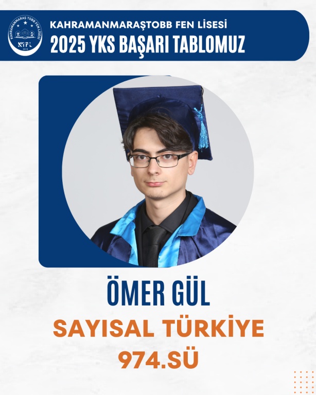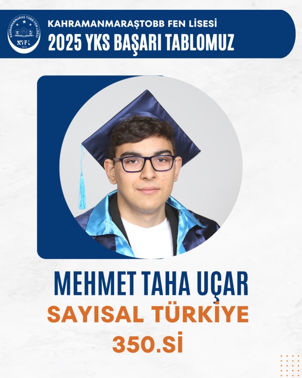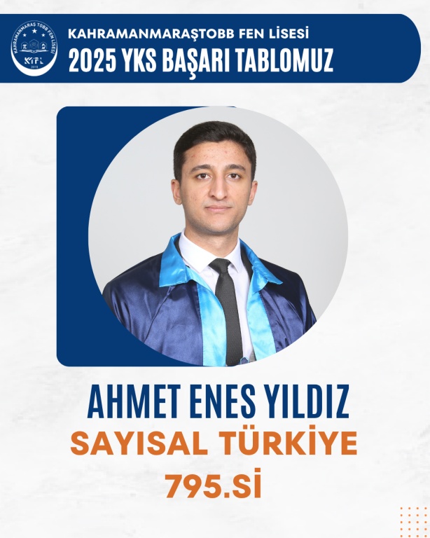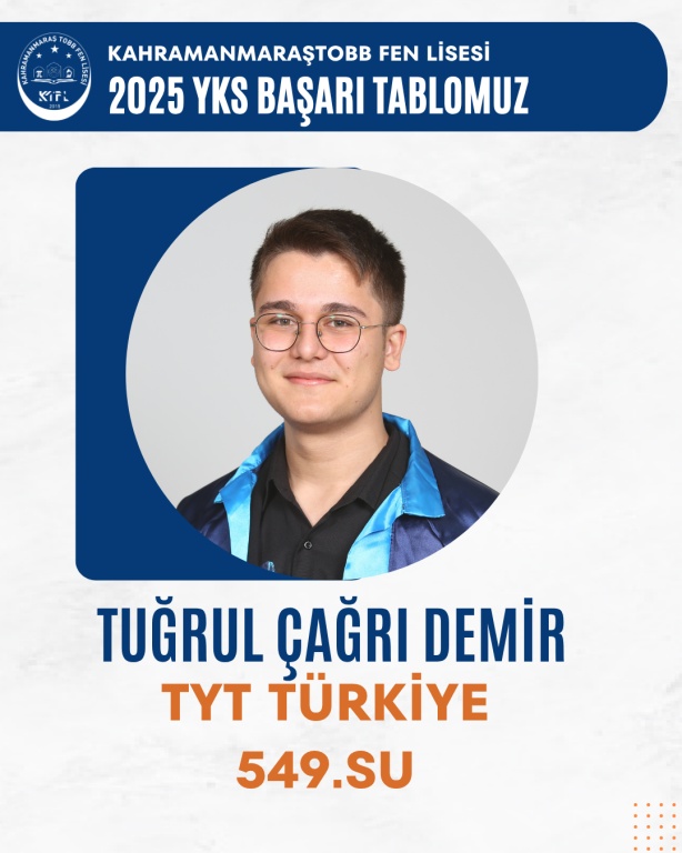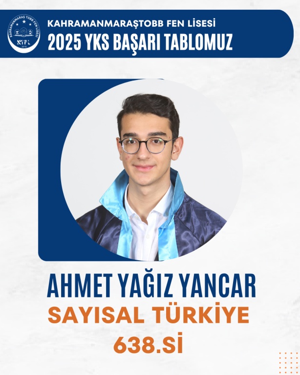 2025 Yükseköğretim Kurumları Sınavı (YKS) sonuçlarına göre Kahramanmaraş TOBB Fen Lisesi, bir kez daha büyük bir başarıya imza attı. Okulumuzdan 6 öğrencimiz, Türkiye genelinde ilk 1000’e girerek hem ailelerini hem de bizleri gururlandırdı. İlk 1000’e giren öğrencilerimizi tebrik ediyor, emeği geçen tüm öğretmenlerimize ve ailelerine teşekkür ediyoruz. Başarılarının daim olmasını diliyoruz.